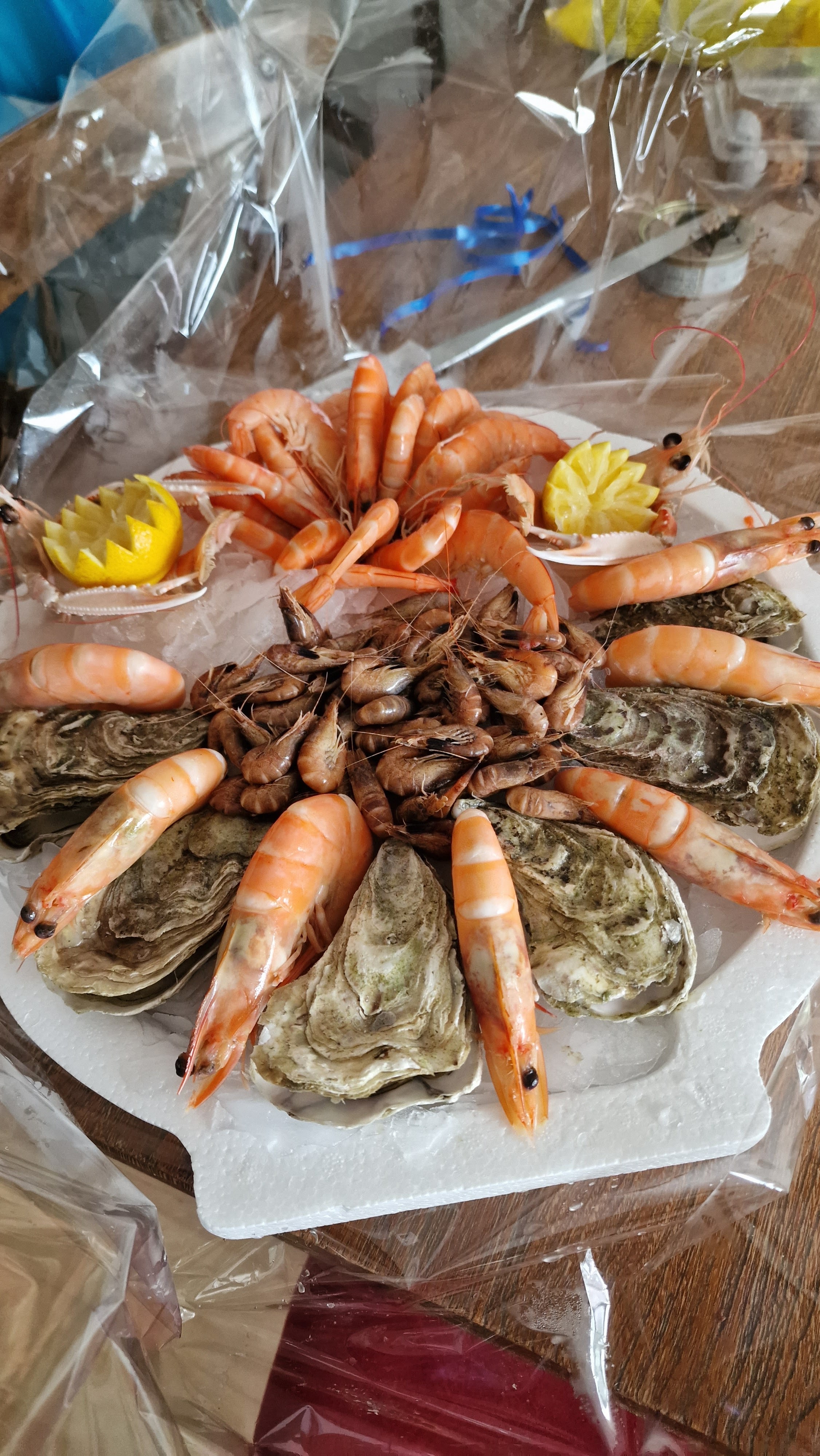 Crevettes grises molles,bulots secs et sans saveur,huitres par 6 ou 12(vendues au kg),pinces de tourteau malodorantes...A FUIR..
